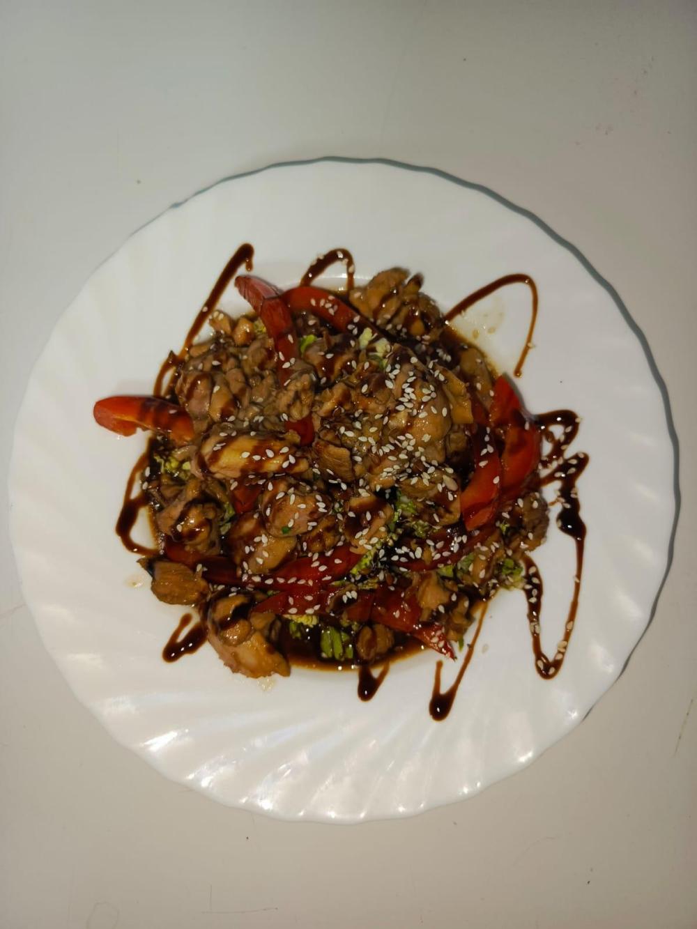Лист салата, соевый соус, болгарский перец, кунжут, куриное филе.