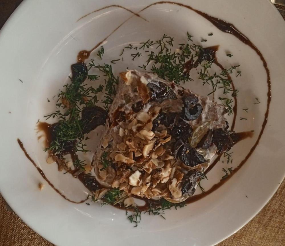 Говяжье филе, чернослив, грецкий орех, белый соус.