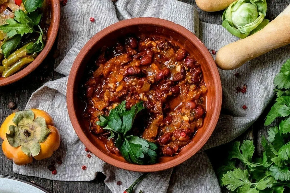 Красная фасоль с чесноком в томатном соусе.
