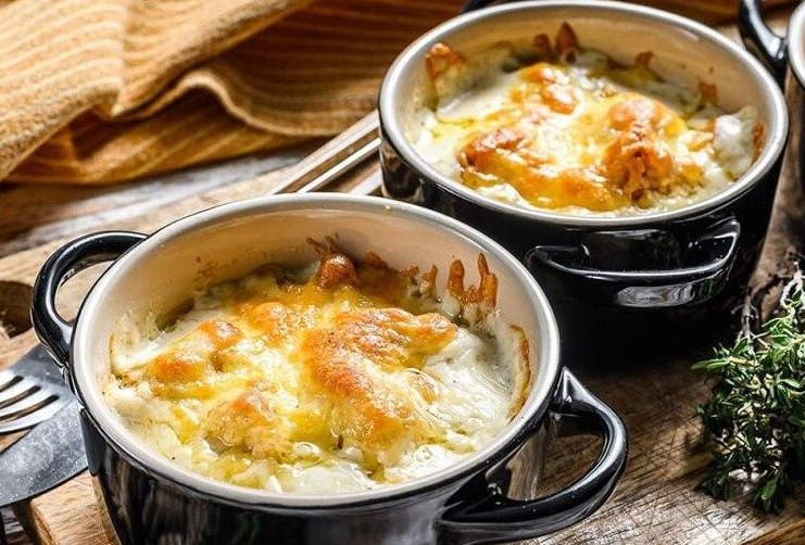 Говяжий язык, шампиньоны, запеченные под сырной шапкой в сливочном соусе.
