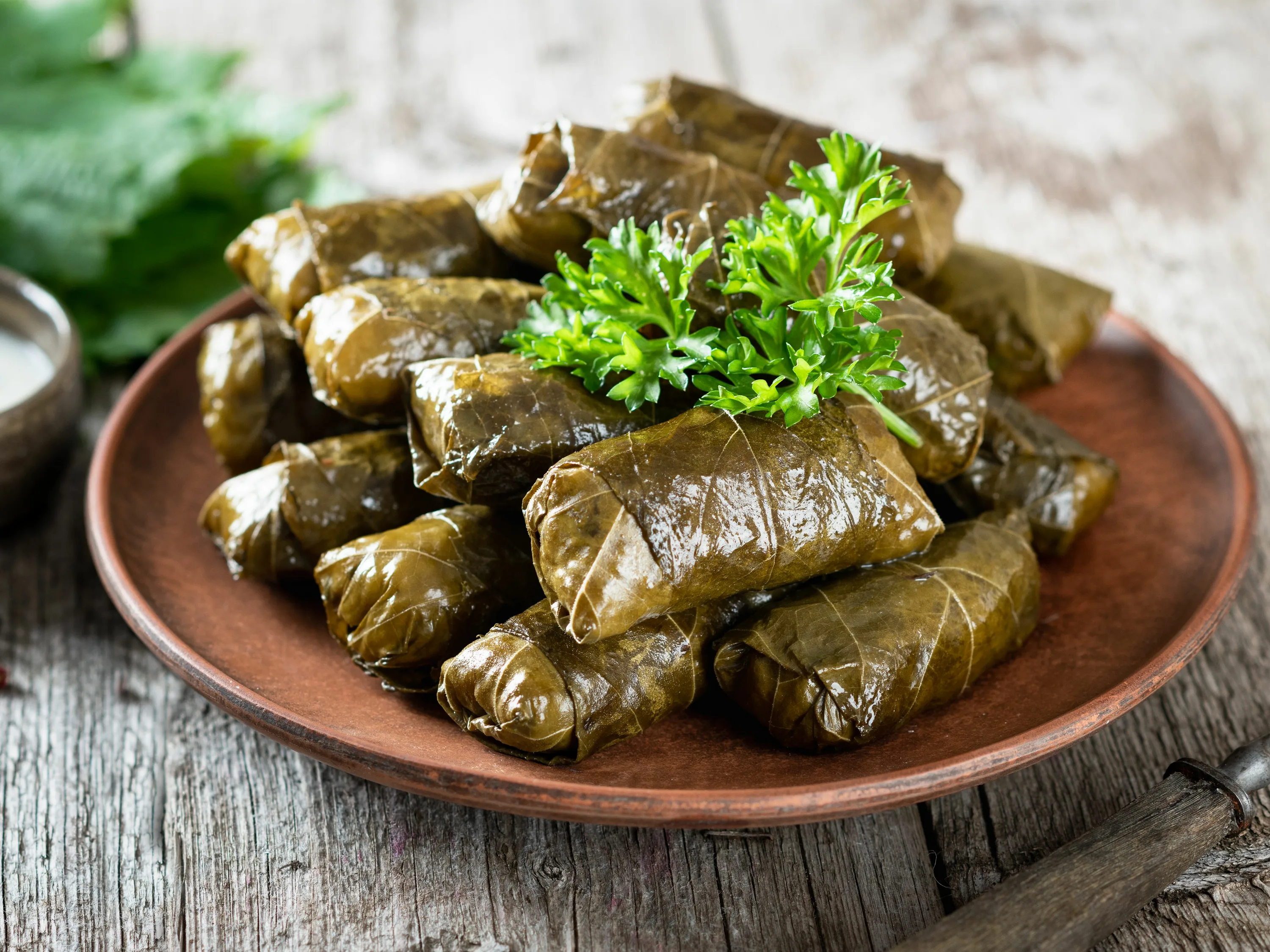 Фарш мясной, листья винограда, специи, зеленый соус.
