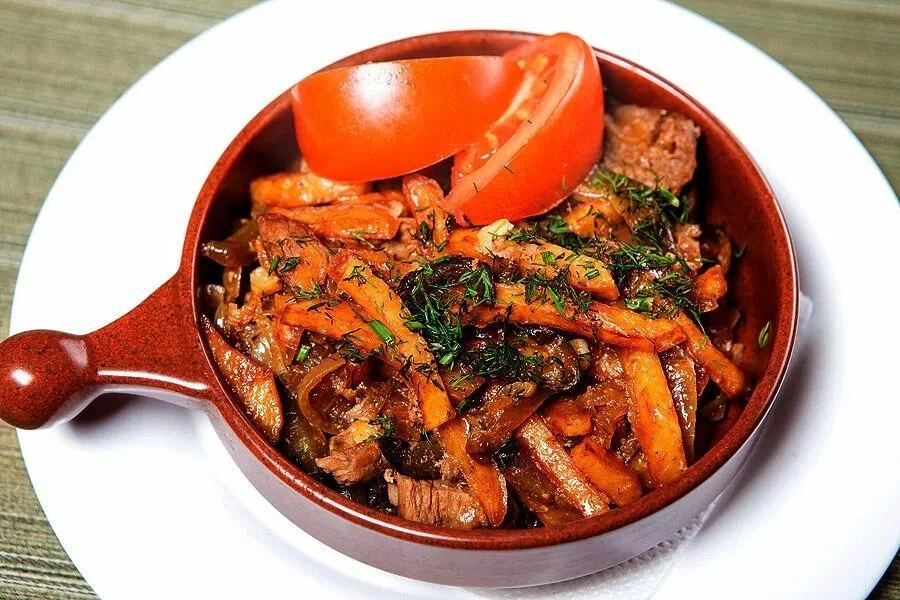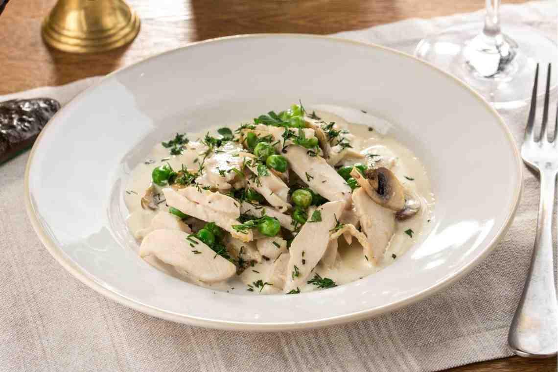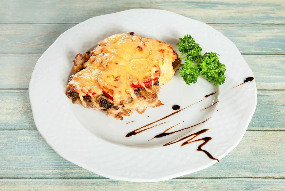 Вырезка свиная, грибы, помидоры, майонез, сыр, лук.